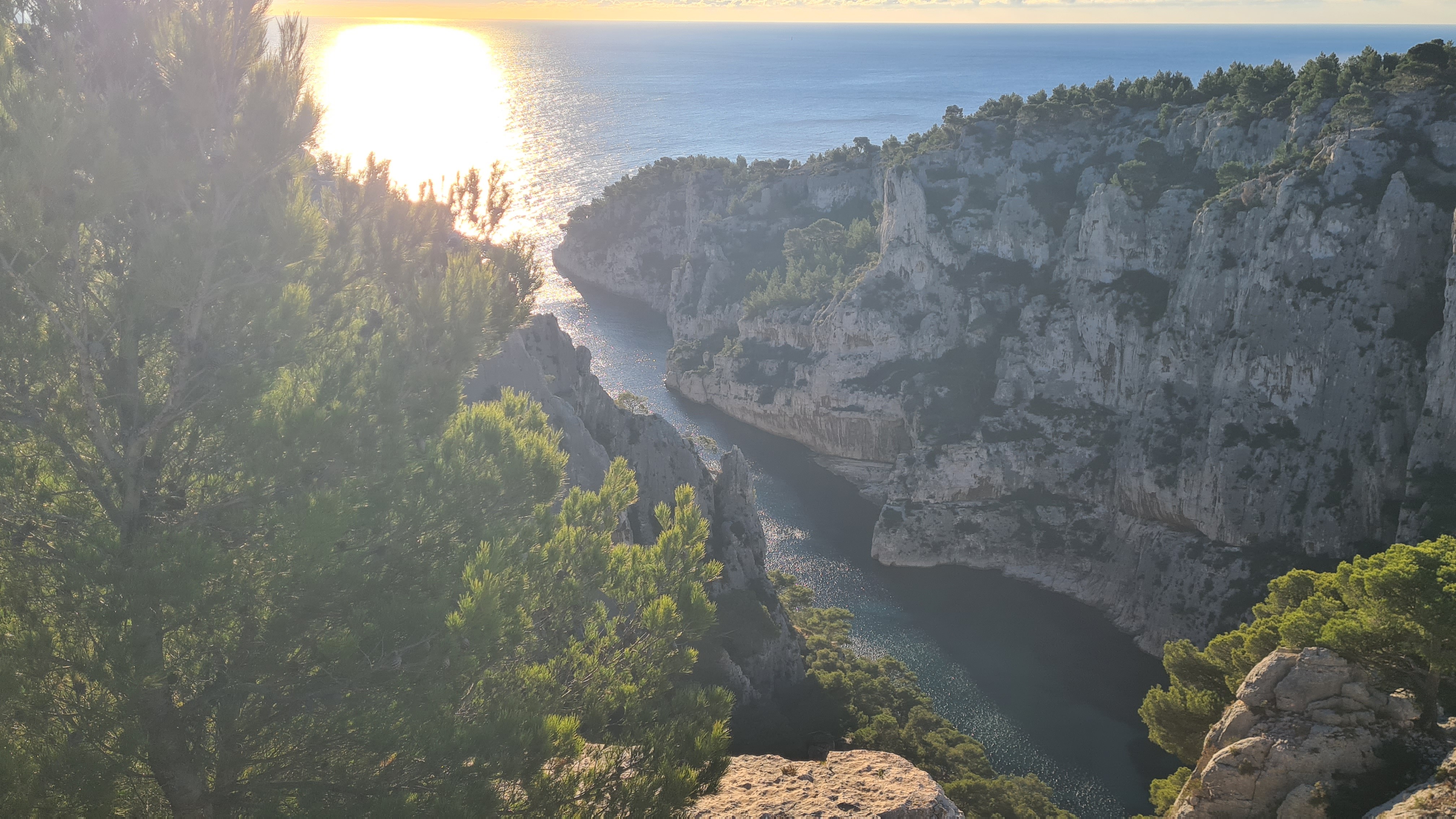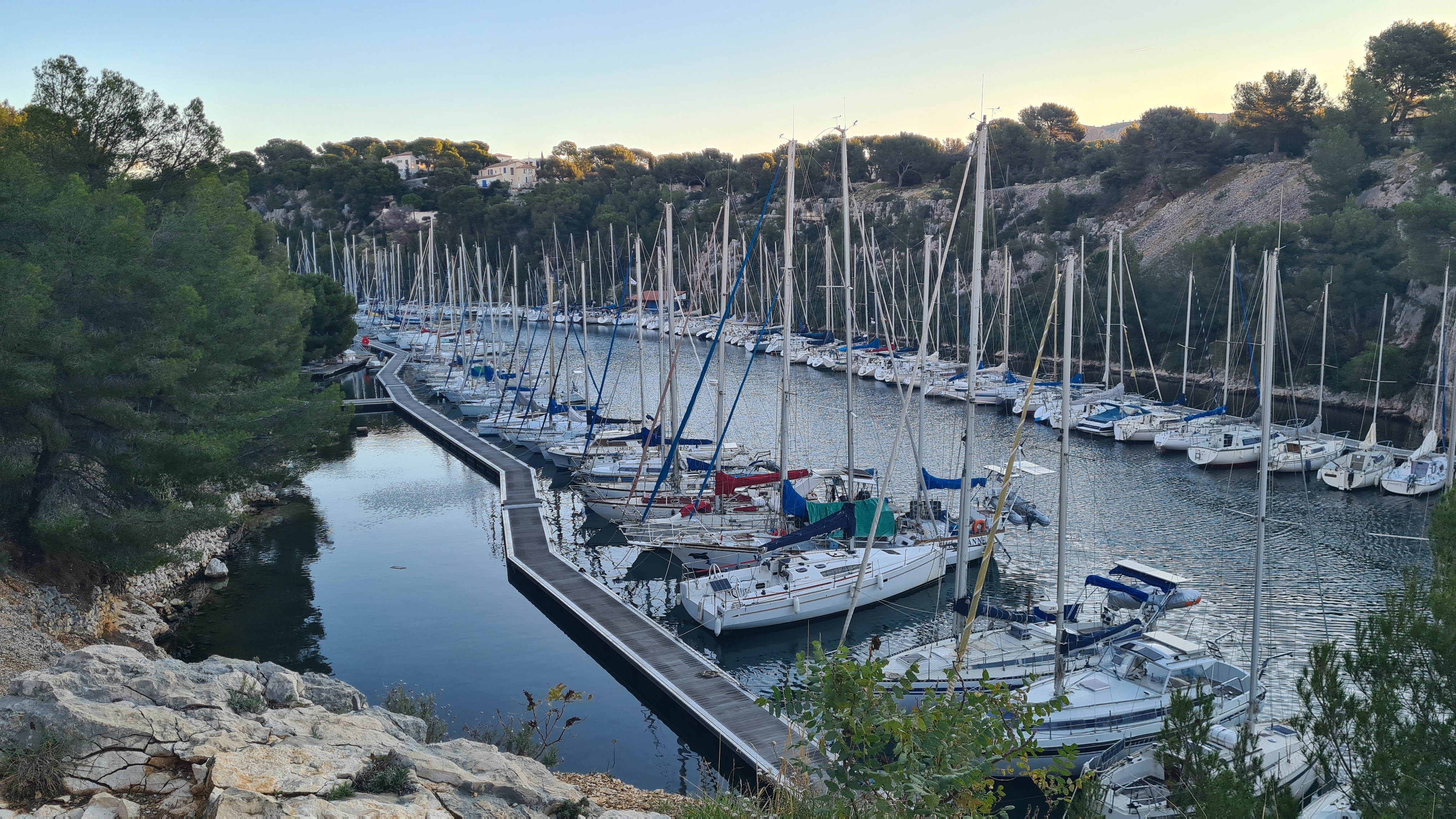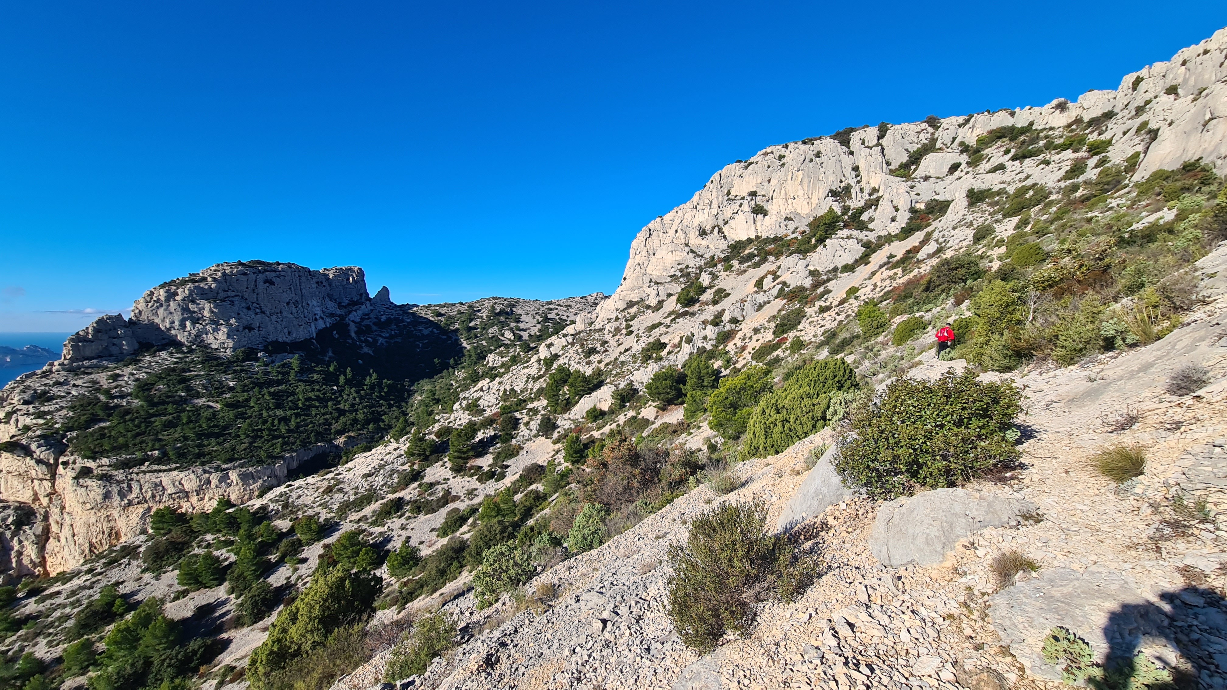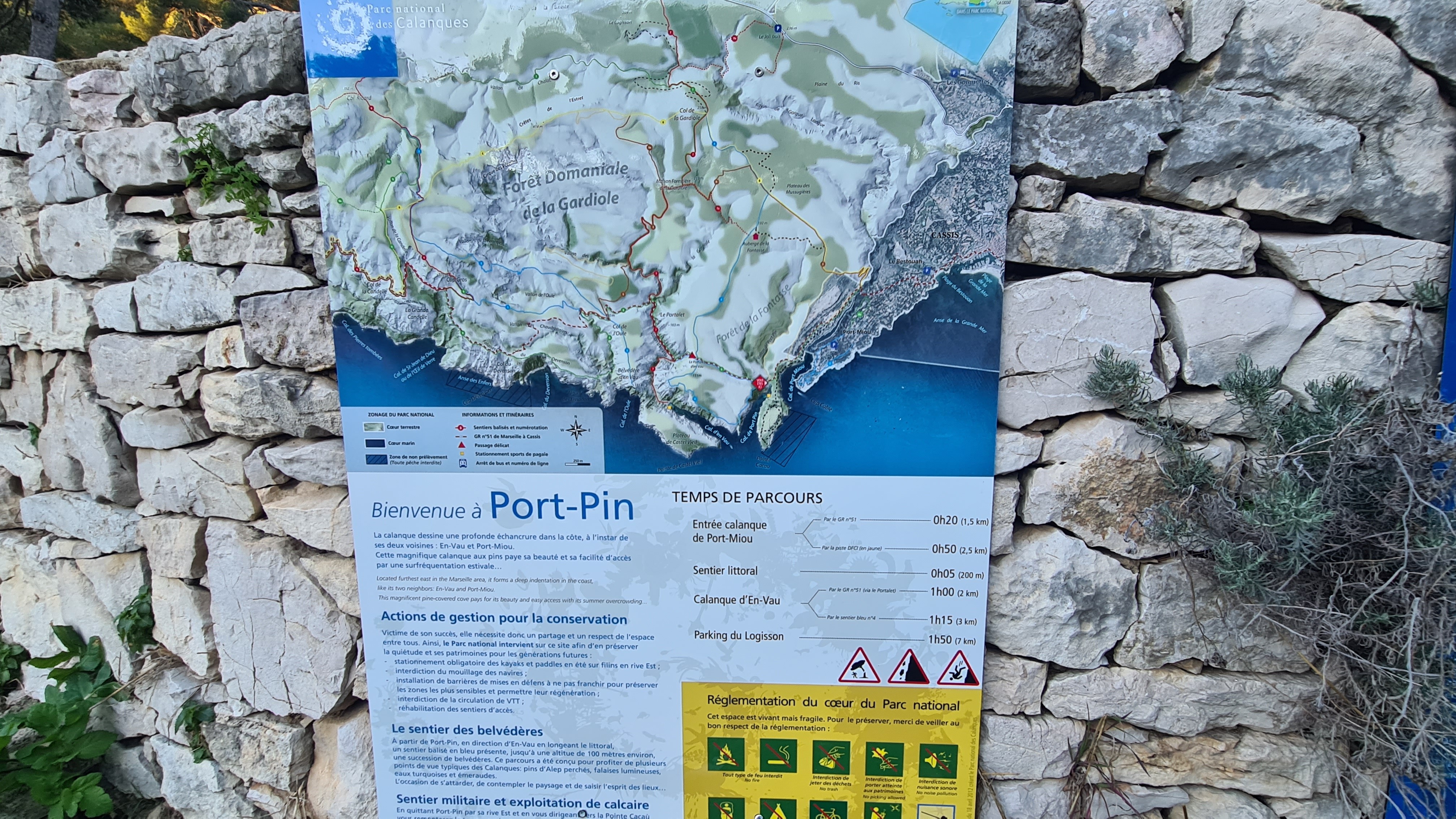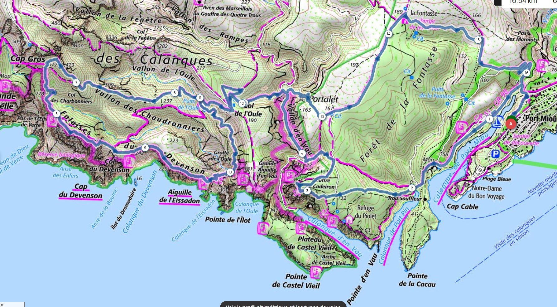 Depuis le parking, rejoindre par le petit sentier Port Miou longer les barrières mise à cause des travaux, rejoindre la calanque par le sentier conseillé, puis monter vers le col, puis un aller retour sur le bleu vers le belvédère, puis descendre dans le vallon par le sentier bien amélioré, partir à droite et se diriger après par le sentier bleu , le col de l’oule, un aller retour vers le belvédère( 2kms environ) descendre dans le virage en bas, le sentier part à droite vers le cap gros que nous allons suivre..sur 2kms environ, nous rejoignons le GR que nous allons descendre, le col des charbonniers, puis remonter vers les crêtes des falaises du Devenson, le gr redescend, passe 2 vallons pour rjoindre le col de l’oule, le vallon d’en vau, puis à gauche, et la montée vers le portalet, un peu plus loin nous avons pris le 1er sentier, (je conseille d’aller plus loin et de prendre la piste vers la droite) car ce sentier, en redescendant nous fait rejoindre, le sentier du GR, qu’il faut alors remonter..puis le retour comme à l aller..